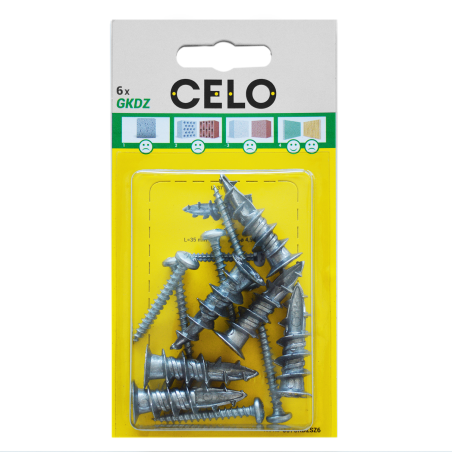 El taco metálico GKDZ se fija directamente sobre la placa de cartón yeso, no es necesario realizar un taladro previo a la placa. Destaca por su rapidez y sencillez a la hora de instalarlo. Está fabricado en zamak con una geometría de bordes afilados que le permite la rápida penetración en el material.